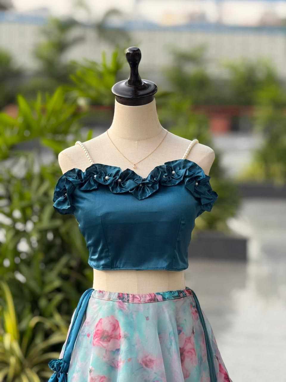 Lehenga – Pure organza silk digital printed lehenga with a grand 8-meter flair, finished with canvas patta for beautiful structure