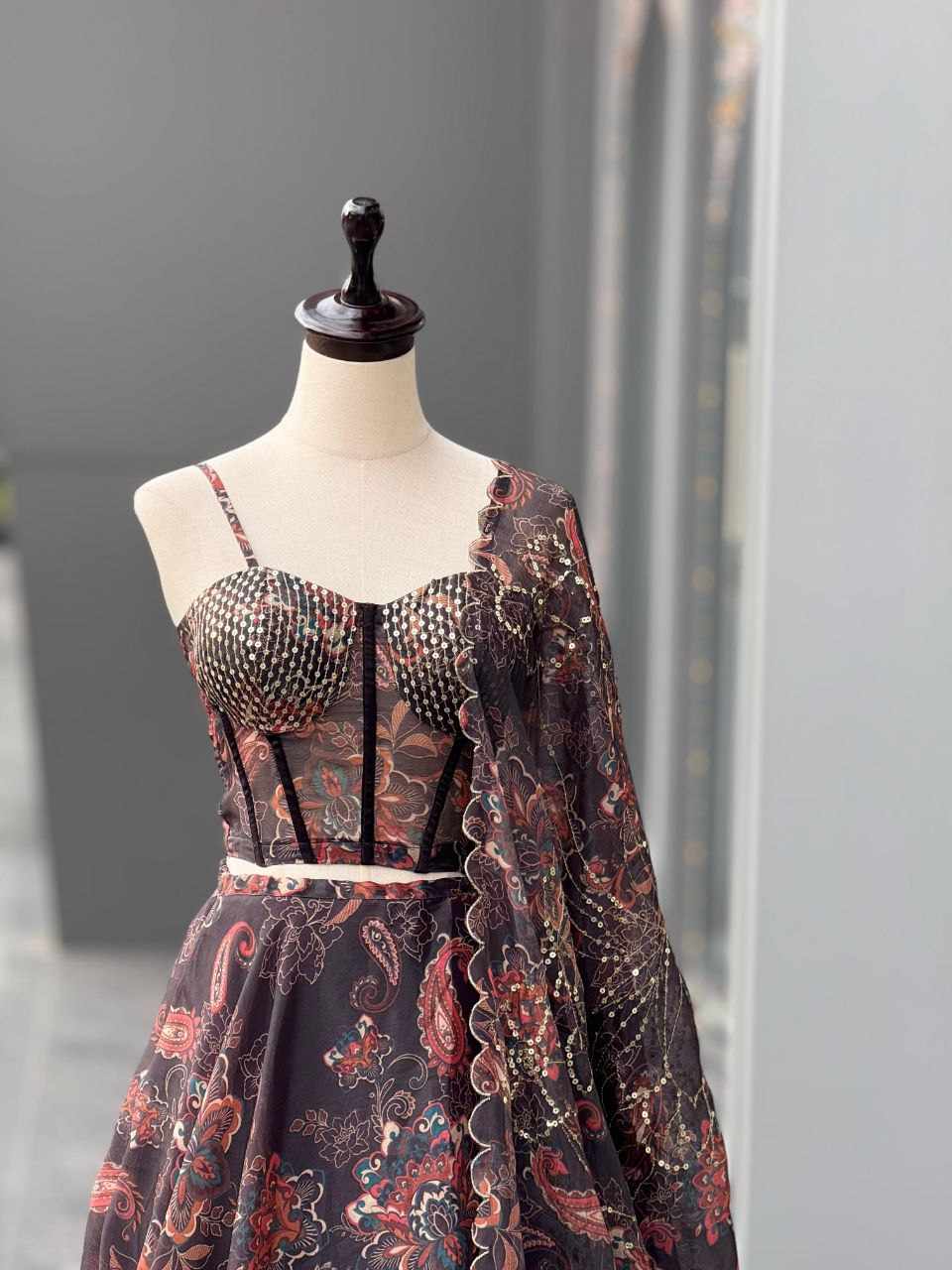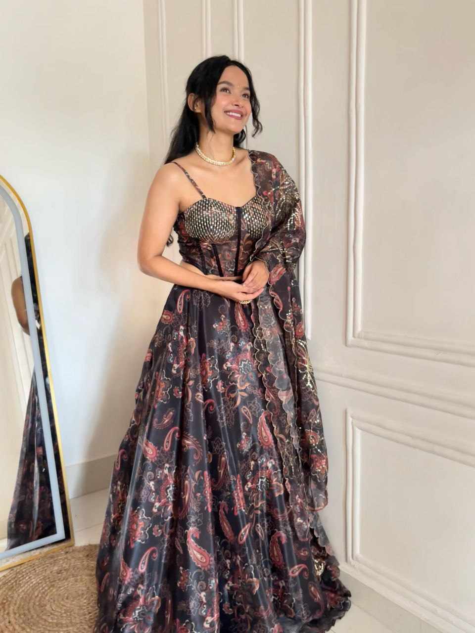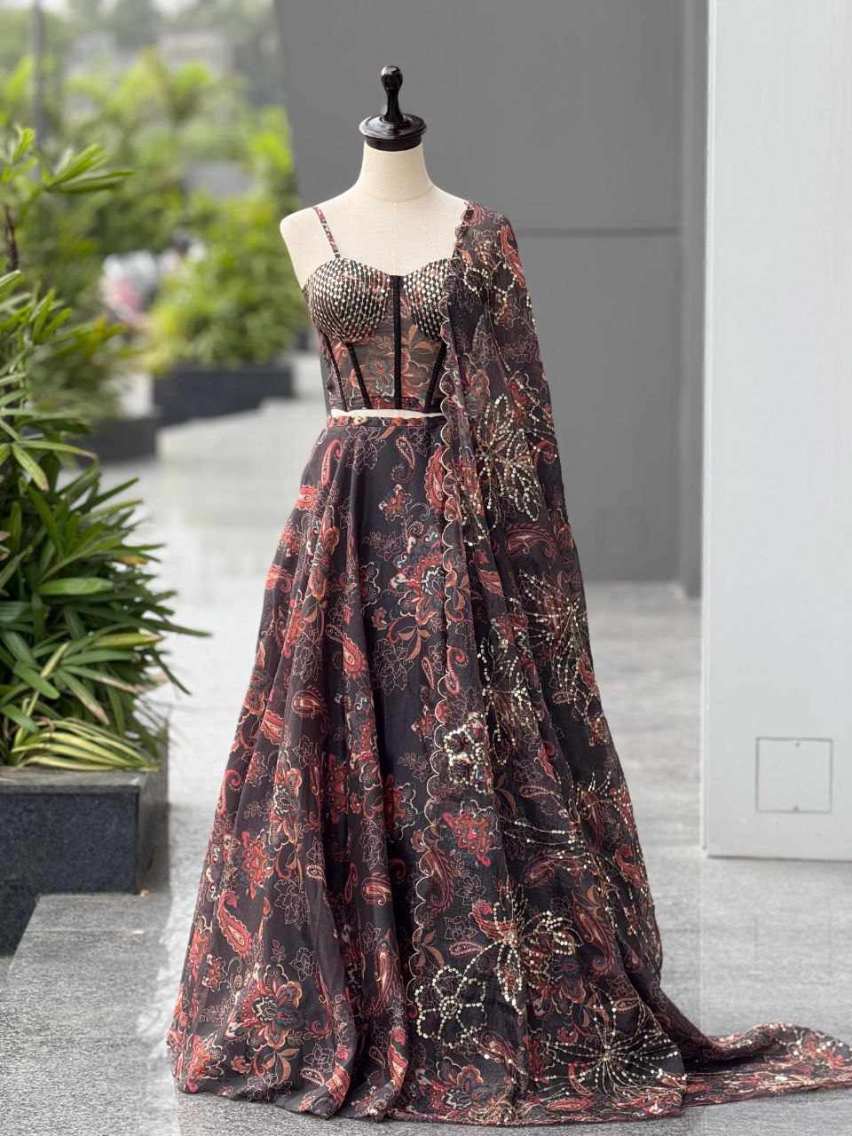 Lehenga – Pure Jimmy Organza digital printed lehenga with a grand 8-meter flair. Comes with canvas patta, can-can, and adjustable waist dori for a perfect fit